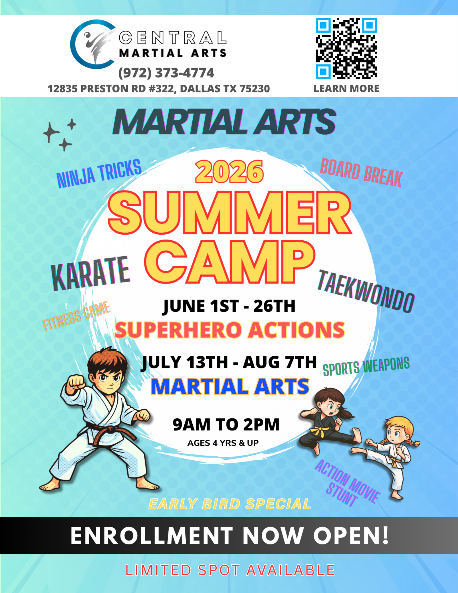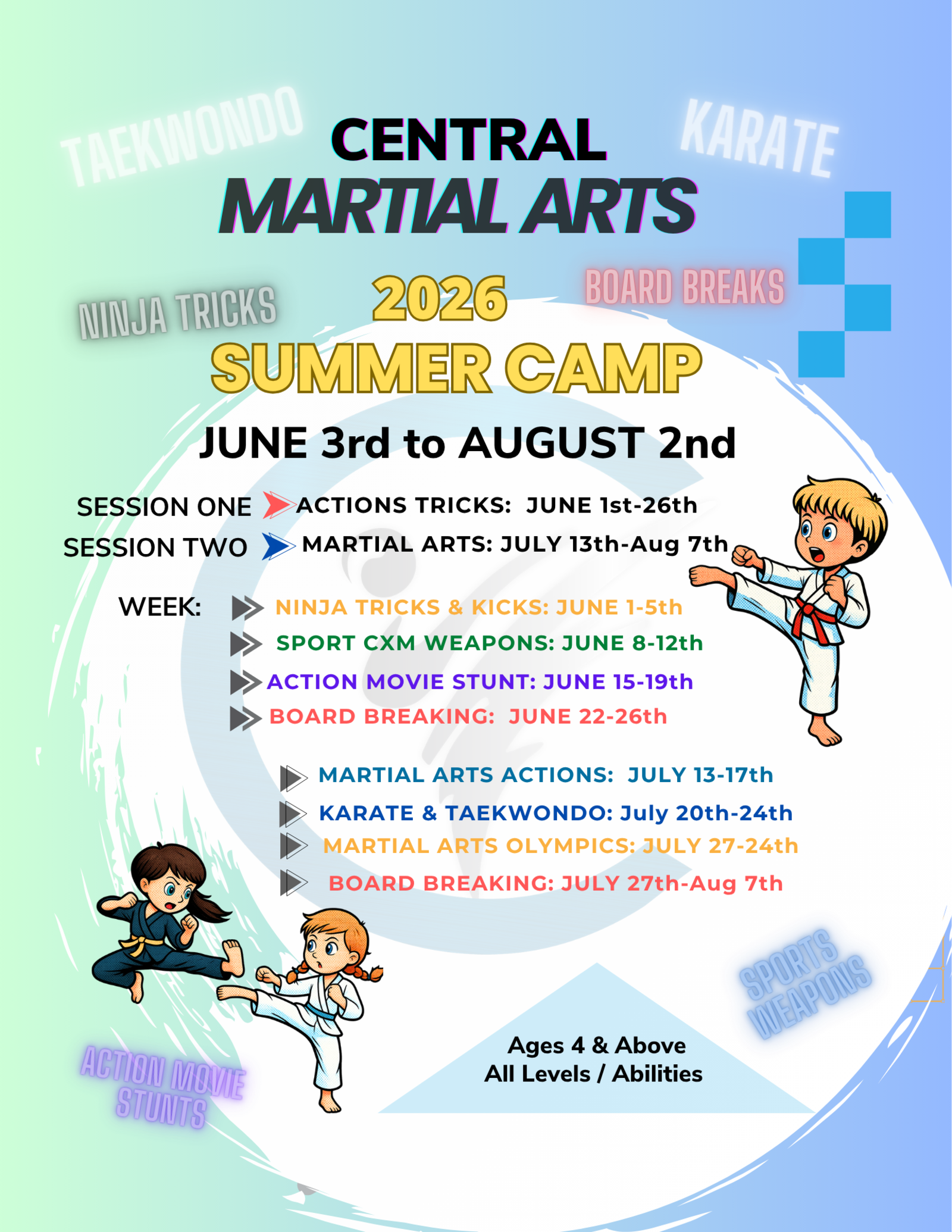 At Central Martial Arts, we focus on more than just physical fitness. Our curriculum is designed to help develop well-rounded individuals by emphasizing the core values of discipline, respect, and self-confidence—skills that stay with them long after the summer ends.